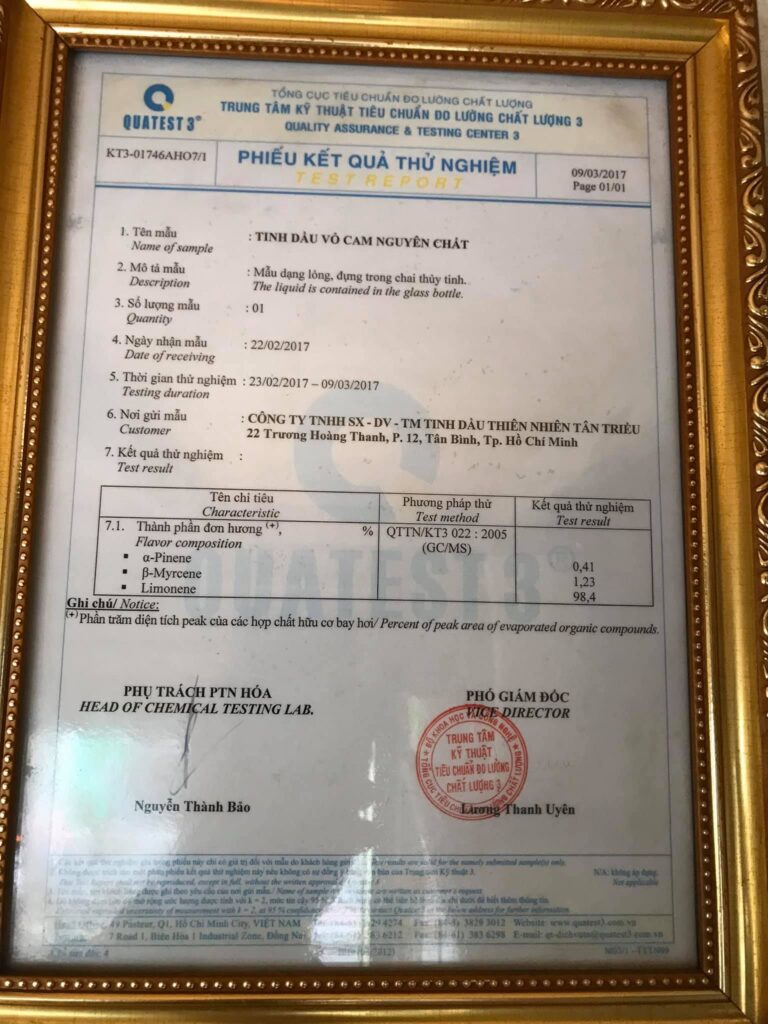 Bảng kiểm nghiệm chất lượng tinh dầu cam ngọt của QUATEST 3